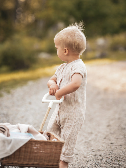 Unan lyhythihaisesta harso-haalarista voit halutessasi valita reilumman koon, aluksi voit kääriä lahkeita, jolloin käyttöikä pitenee. Kuvista näet haalareita eri kokoisten lasten yllä. Unan lasten harsovaatteiden koot vastaavat tuplakoon isompaa kokoa.