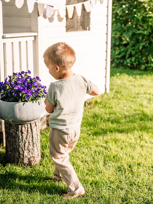 Unan harso-housut ovat malliltaan rennot ja normaalin levyiset. Lahkeita voit halutessasi kääriä, jolloin housujen käyttöikä pitenee. Unan lasten harsovaatteiden koot vastaavat tuplakoon isompaa kokoa.