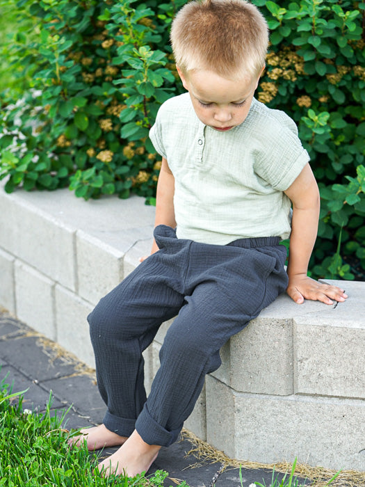 Unan harso-housut ovat malliltaan rennot ja normaalin levyiset. Lahkeita voit halutessasi kääriä, jolloin housujen käyttöikä pitenee. Unan lasten harsovaatteiden koot vastaavat tuplakoon isompaa kokoa.
