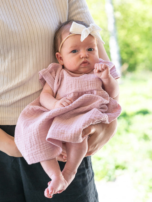 Unan lyhythihainen harso-mekko sopii mallin puolesta eri kokoisille käyttäjille. Voit halutessasi valita reilumman koon, aluksi mekko on lapselle pidempi ja myöhemmin muuttuu tunika-mittaiseksi. Unan lasten harsovaatteiden koot vastaavat tuplakoon isompaa kokoa.