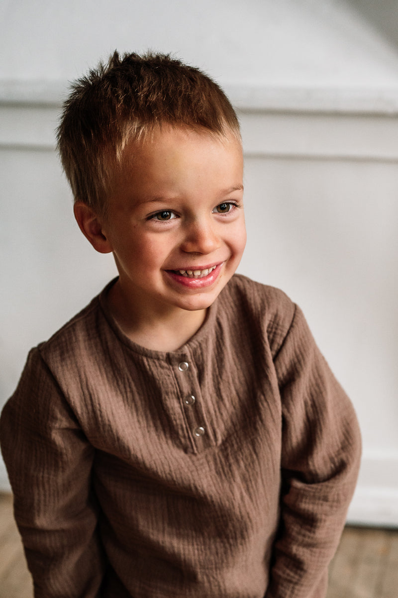 Unan pitkähihaisesta harso-paidasta voit halutessasi valita reilumman koon, aluksi voit kääriä hihoja, jolloin käyttöikä pitenee. Kuvista näet paitoja eri kokoisten lasten yllä. Unan lasten harsovaatteiden koot vastaavat tuplakoon isompaa kokoa.