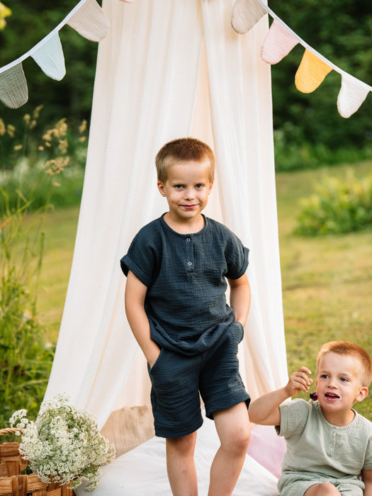 Unan lyhythihainen harso-paita on malliltaan rento ja väljä. Kuvista näet paitoja eri kokoisten lasten yllä. Unan lasten harsovaatteiden koot vastaavat tuplakoon isompaa kokoa.
