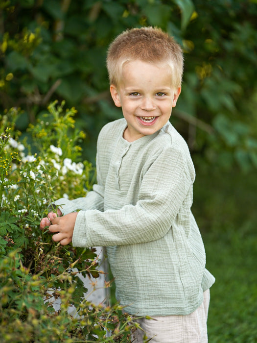 Unan pitkähihaisesta harso-paidasta voit halutessasi valita reilumman koon, aluksi voit kääriä hihoja, jolloin käyttöikä pitenee. Kuvista näet paitoja eri kokoisten lasten yllä. Unan lasten harsovaatteiden koot vastaavat tuplakoon isompaa kokoa.