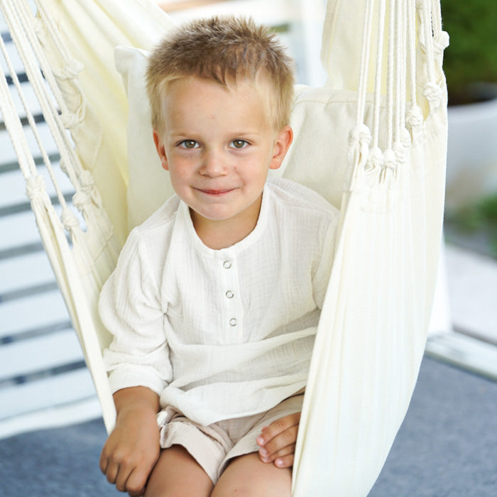 Unan pitkähihaisesta harso-paidasta voit halutessasi valita reilumman koon, aluksi voit kääriä hihoja, jolloin käyttöikä pitenee. Kuvista näet paitoja eri kokoisten lasten yllä. Unan lasten harsovaatteiden koot vastaavat tuplakoon isompaa kokoa.