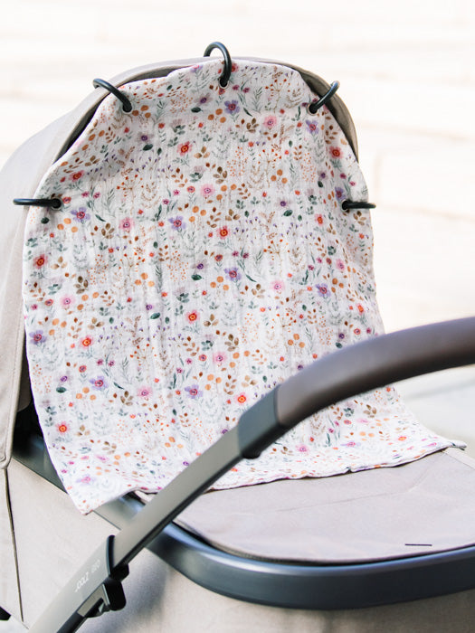 Verho on helppo kiinnittää mukana tulevilla monitoimirenkailla, ja sen kevyt malli sopii useimpiin vaunuihin. Kukallinen kuosi tuo pientä juhlaa arkeen ja tekee vaunuhetkistä entistä ihanampia. Koko noin 43 × 49 cm.