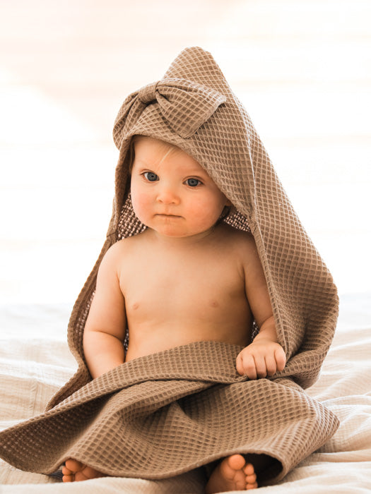 Vohvelikangas tuntuu miellyttävältä ihoa vasten ja kuivaa nopeasti. Huppua koristaa kaunis rusetti, joka tekee pyyhkeestä entistä suloisemman. Ihana lahjaidea vauvalle tai taaperolle.
