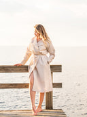 Vohvelikangas tuntuu miellyttävältä ihoa vasten ja kuivaa nopeasti käytön jälkeen. Malli on sama kuin miesten lannepyyhkeessä, joten se sopii kauniisti myös yhteensopivaksi pariksi.