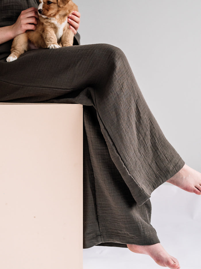 Unan harso-olohousut ovat ihanan kevyet ja pehmeät housut rentoon oleskeluun. Ilmava harsokangas tuntuu miellyttävältä ihoa vasten ja laskeutuu kauniisti – täydellinen valinta kotipäiviin, rauhallisiin hetkiin ja pehmeään arkeen.