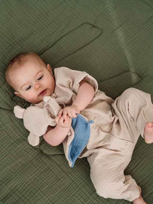 Unan Uninalle on ihanan pehmeä ja hellyttävä kaveri vauvalle. Kevyt harsokangas tuntuu miellyttävältä pientä vasten, ja nallen pienissä taskuissa pysyy tutti tai muut pienet aarteet tallessa.