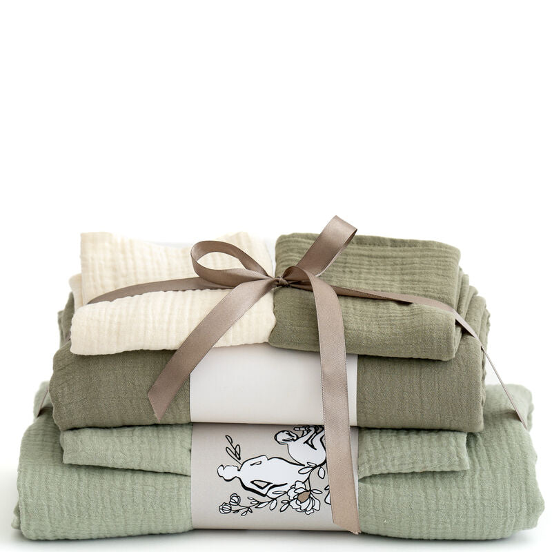 Lahjassa mukana on pehmeät pussilakanat, monikäyttöinen Syli-harsoviltti, kaksi mini-harsoa sekä onnittelukortti. Kauniisti narulla sidottu paketti on valmis annettavaksi. Halutessasi kirjoitamme tervehdyksen korttiin puolestasi.