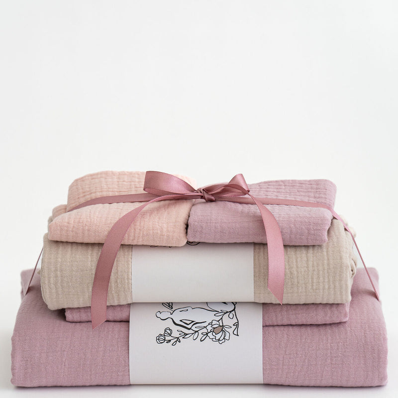 Lahjassa mukana on pehmeät pussilakanat, monikäyttöinen Syli-harsoviltti, kaksi mini-harsoa sekä onnittelukortti. Kauniisti narulla sidottu paketti on valmis annettavaksi. Halutessasi kirjoitamme tervehdyksen korttiin puolestasi.