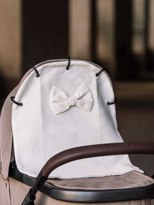 Vaunuverhoa koristaa kaunis rusetti, joka on valmistettu samasta pehmeästä vohvelikankaasta. Mukana tulevat monitoimirenkaat tekevät kiinnittämisestä helppoa, ja malli sopii useimpiin vaunuihin. Koko noin 43 × 49 cm.