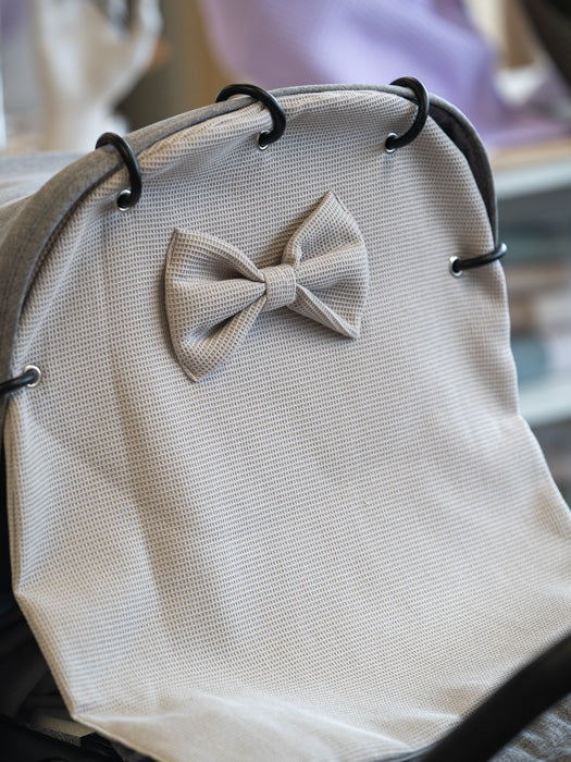 Vaunuverhoa koristaa kaunis rusetti, joka on valmistettu samasta pehmeästä vohvelikankaasta. Mukana tulevat monitoimirenkaat tekevät kiinnittämisestä helppoa, ja malli sopii useimpiin vaunuihin. Koko noin 43 × 49 cm.