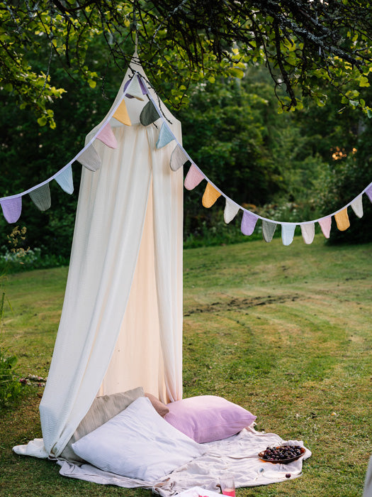 Unan vuodekatos on ihana ja pehmeä sisustuselementti lastenhuoneeseen. Kevyt harsokangas laskeutuu kauniisti ja luo sängyn tai lukunurkan ylle rauhallisen, satumaisen tunnelman.