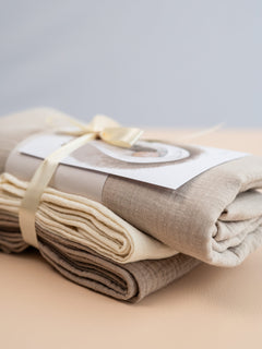 Presentförpackningen innehåller en mångsidig babyfilt, två av Unas populära muslinfiltar och ett gratulationskort. Paketet är vackert knutet med snöre och klart att ge bort. Om du vill kan vi skriva en hälsning på kortet åt dig.
