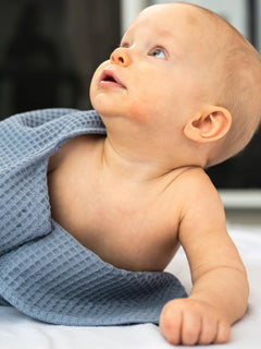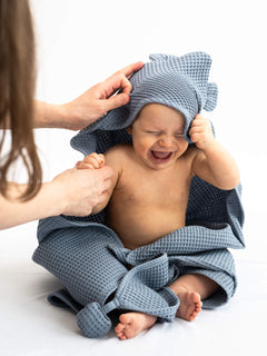 Det våffelvävda tyget torkar effektivt och känns skönt mot huden. Badhandduken är utsmyckad med söta björnöron och har en liten tofs i nedre hörnet. En fin presentidé till en bebis eller ett litet barn.